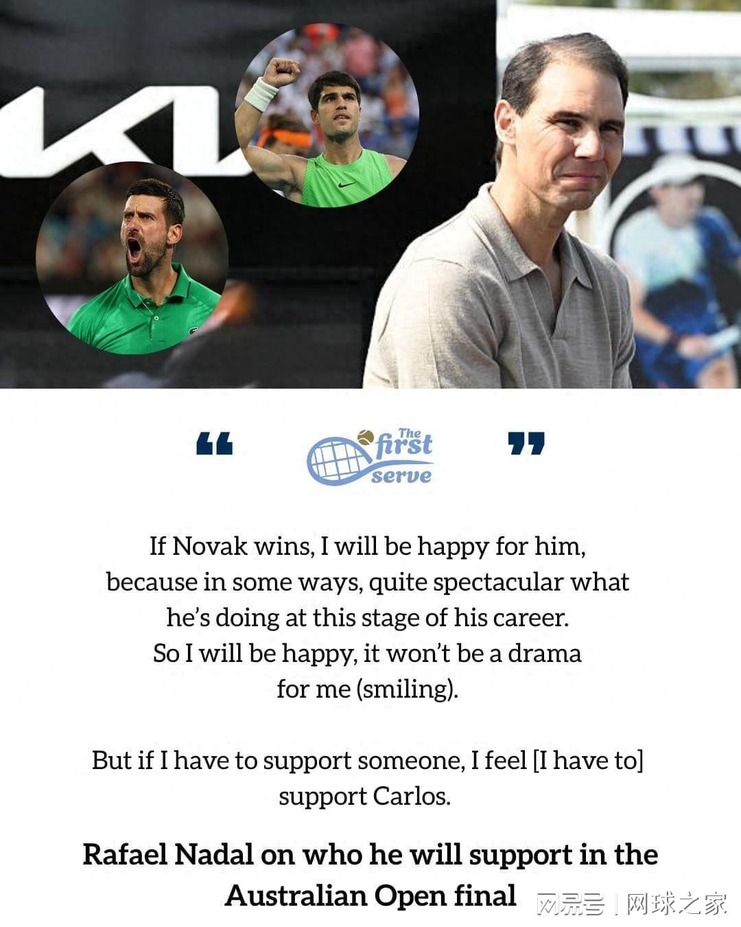 非常巧的是,今年澳网官方早已经放出确切消息,纳达尔将会在德约和阿尔卡拉斯的冠军争夺战现身,并参加相关活动。现在德约提到纳达尔,更让西班牙传奇在澳网受到了外界的强烈关注,意外爆火了一把。